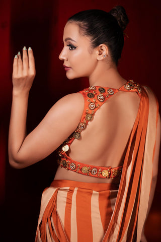 Shine like a star in our RAAR RUST SAREE! This unique sharara saree boasts a stunning peach and rust color combination, accented by elegant kundan detailing on the blouse. Perfect for any special occasion!