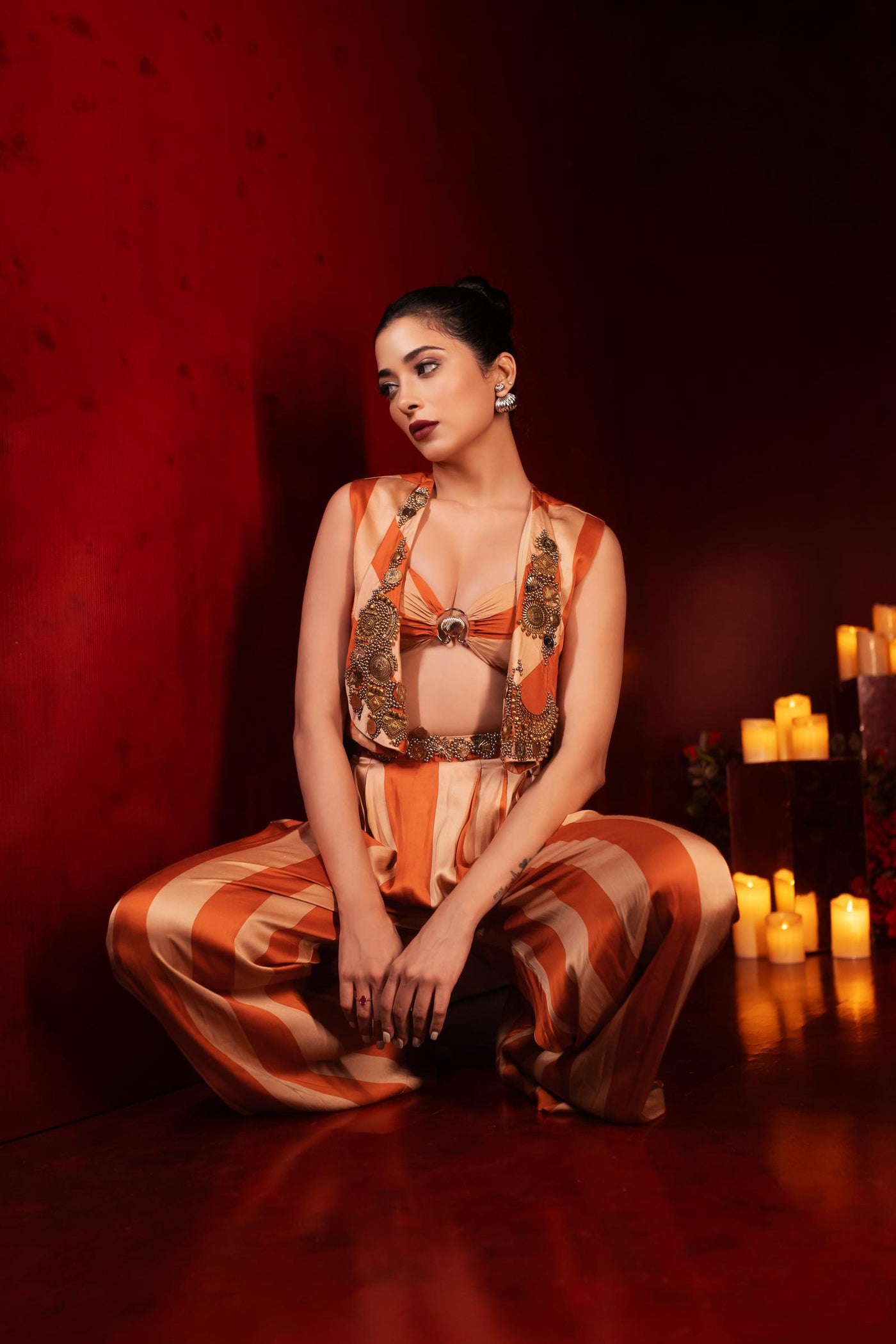 Get ready to turn heads in the RAAR RUST VEST SET. This peach and rust striped dream is perfect for any occasion - from being a standout bridesmaid at a mehndi to a night out with the girls. The set includes a bralette, short vest jacket and pants, all featuring the perfect blend of golden jewels. Own your style and let it shine!
