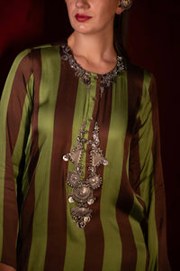 Enhance your style with the RÚÚH striped set, the hot-seller of the season. This co-ord set features peach and rust stripes, accented with silver & gold ornamentation, for a chic look. Perfect for small intimate outings, this set will elevate your fashion game.